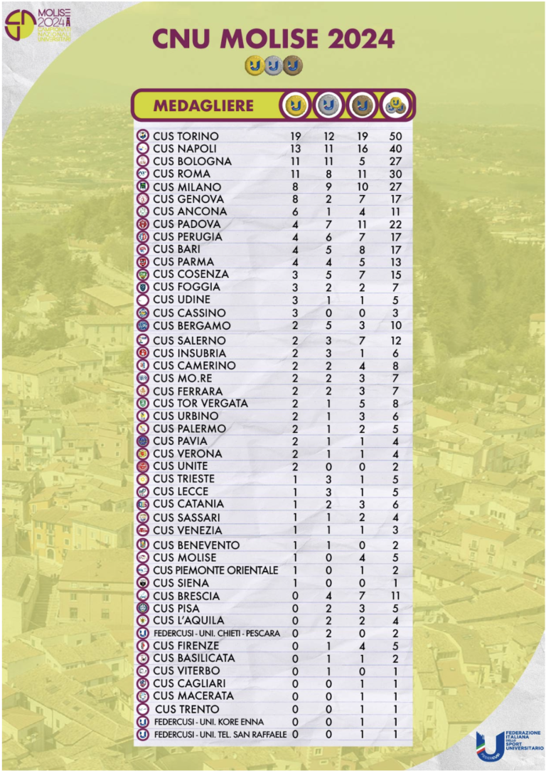 Il CUS BENEVENTO ha partecipato ai Campionati Nazionali Universitari 2024 che si sono svolti in Molise con le studentesse Fabiola Caruso e Alessia Calandrella. Nelle categorie lancio del martello e lancio del disco l’atleta-studente Fabiola Caruso ha conquistato una medaglia d’oro e una medaglia d’argento.